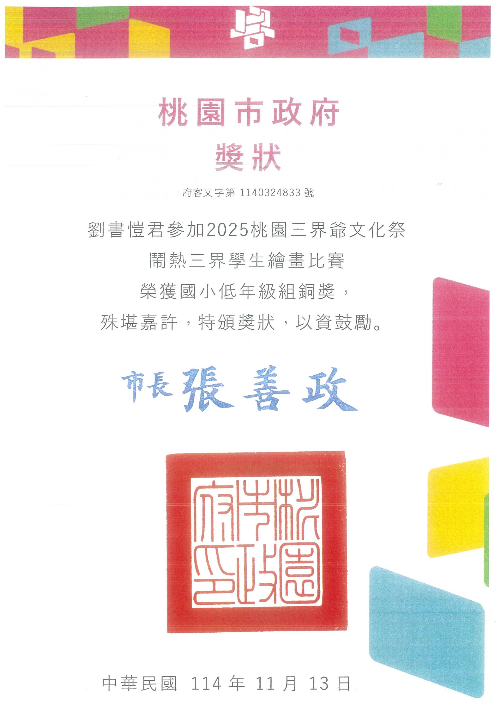 榮獲 2025桃園三界爺文化祭-鬧熱三界學生繪畫比賽 國小低年級組銅牌獎