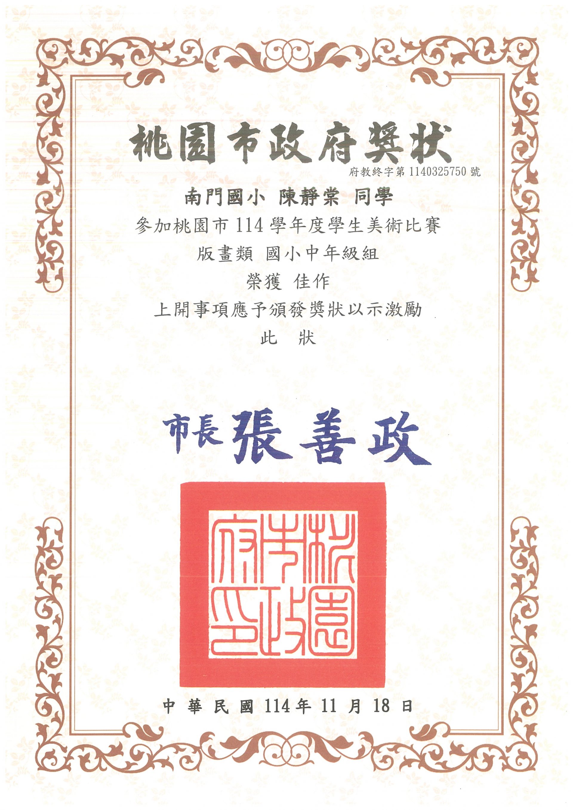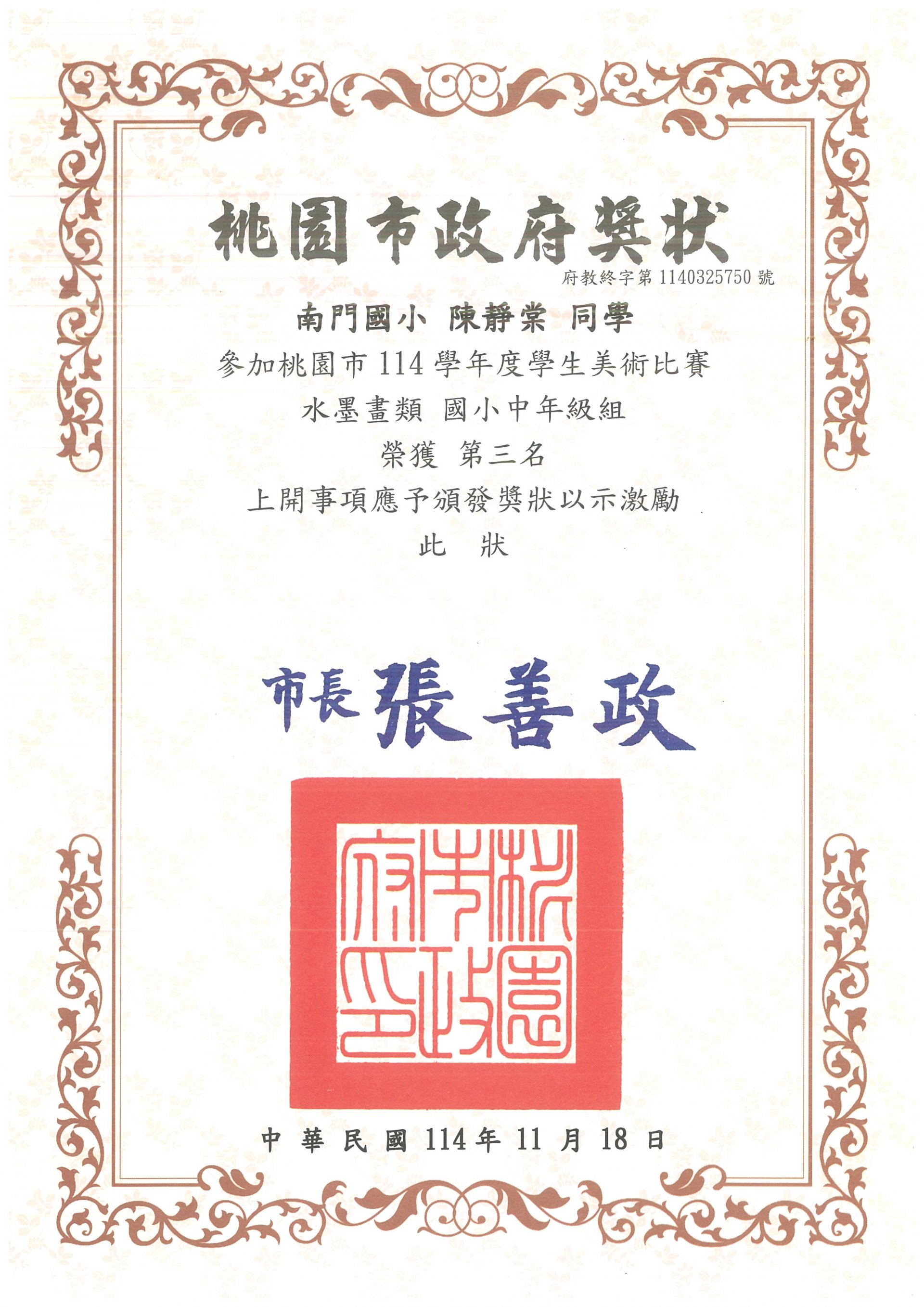 榮獲 桃園市114學年度學生美術比賽 水墨畫類國小中年級組 第三名