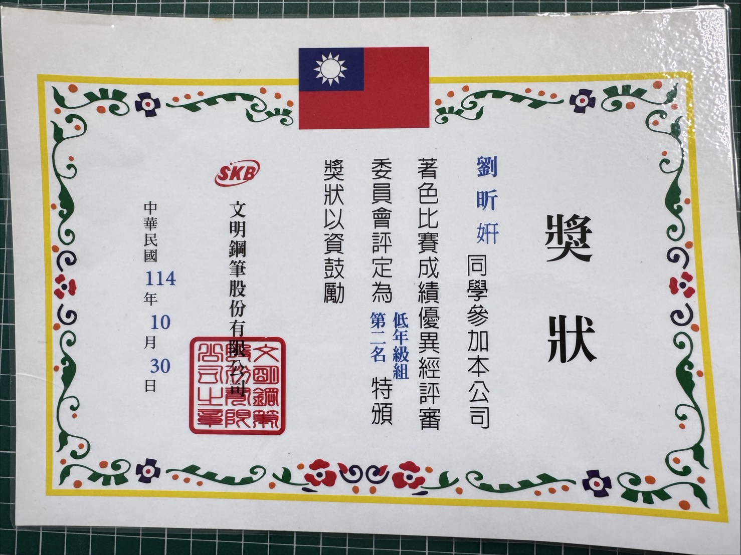 榮獲 文明鋼筆股份有限公司著色比賽 低年級組第二名
