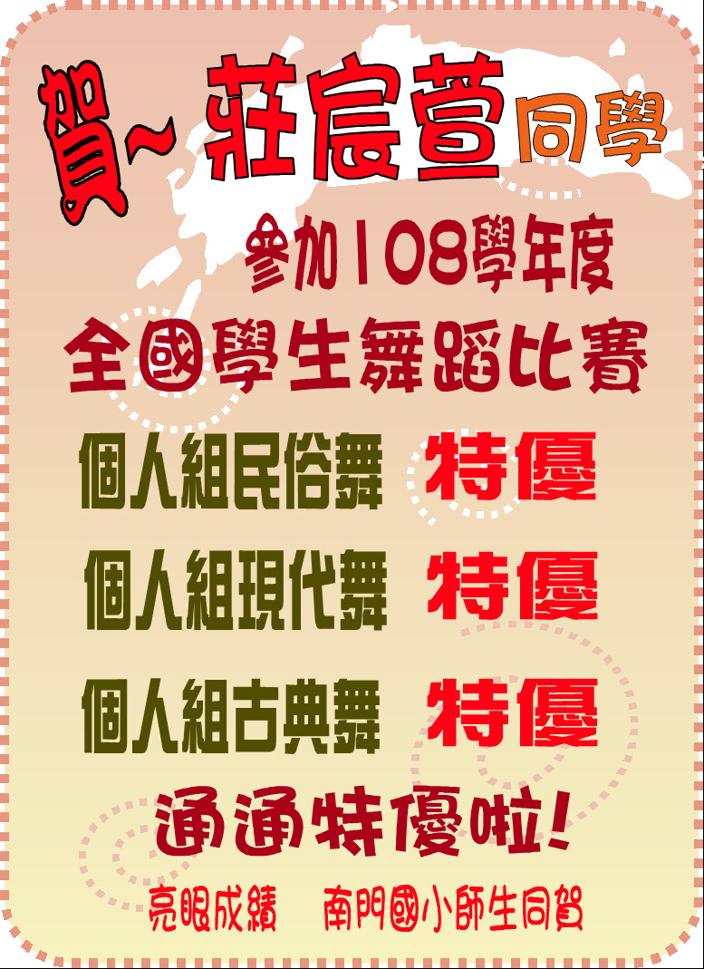 賀!6年2班學生莊宸萱參加108學年度學生舞蹈比賽決賽,成績優異!