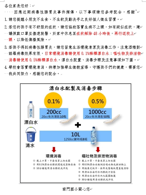 訊息轉知:因應病毒腸胃炎,生活環境清潔、漂白水配置及消毒步驟說明如圖所示,請參照!