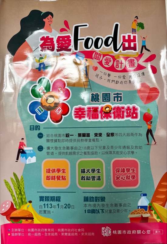 1、結合桃園市統一、萊爾富、來來(OK)、全家等四大超商作為關懷據點,即時提供急難求助之弱勢學童餐點。