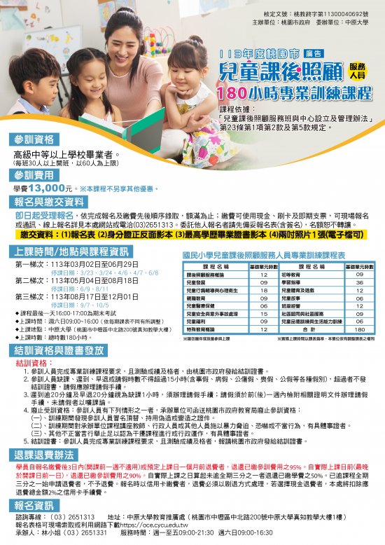 轉知中原大學辦理桃園市113年度兒童課後照顧服務人員180小時專業訓練課程