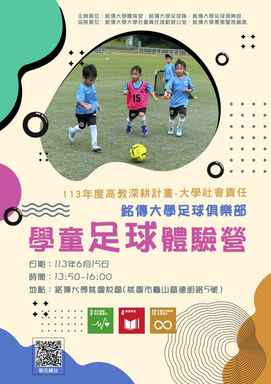 一、銘傳大學足球俱樂部於113年6月15日(星期六)下午13:50-16:00辦理免費足球體驗營, 邀請桃園市國小及幼兒園學童踴躍參加。