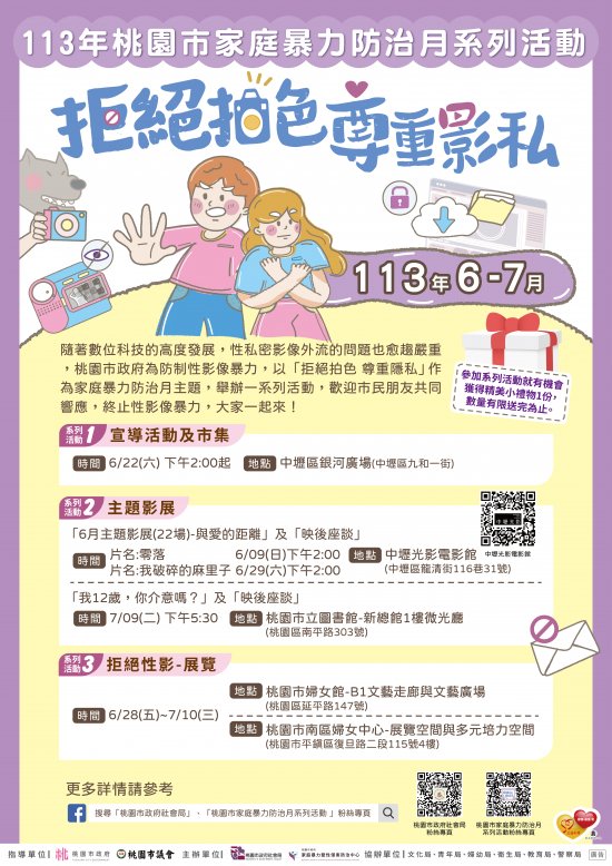 家庭暴力暨性侵害防治中心113年6至7月辦理「113年家庭暴力防治月系列活動」活動,鼓勵貴校親師生參與。