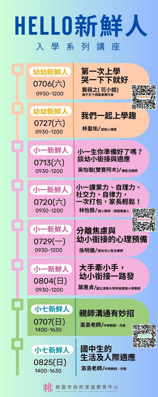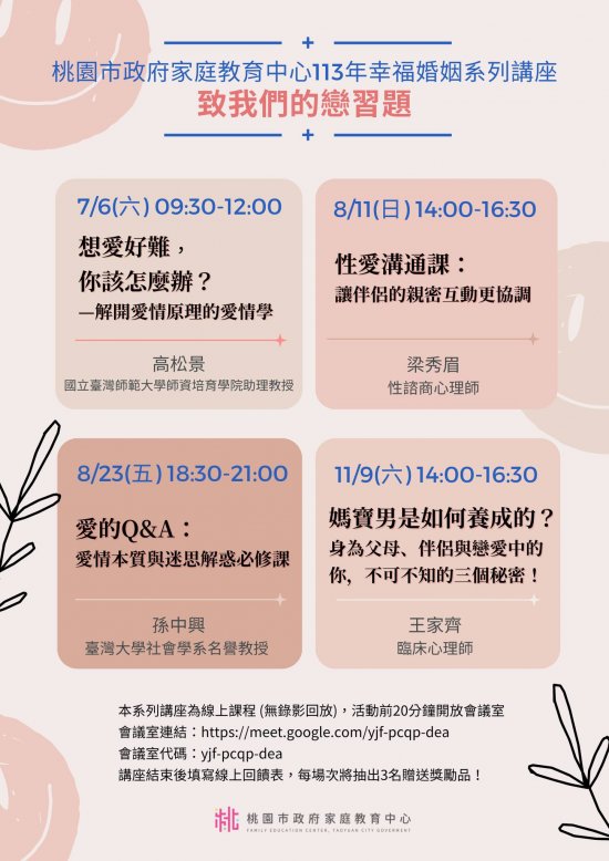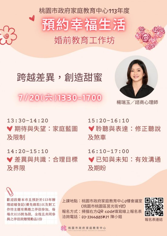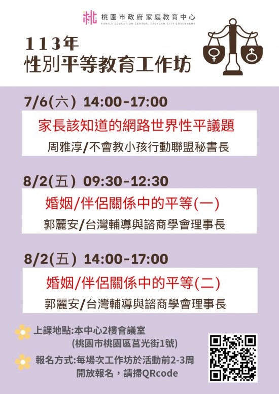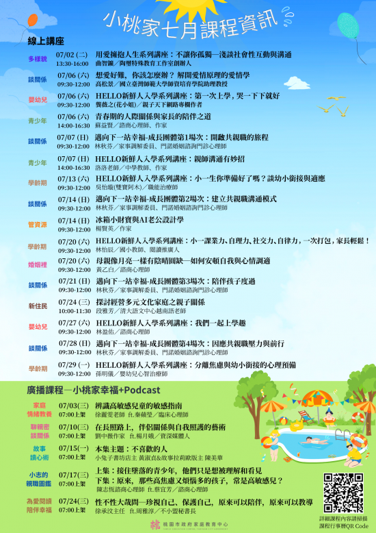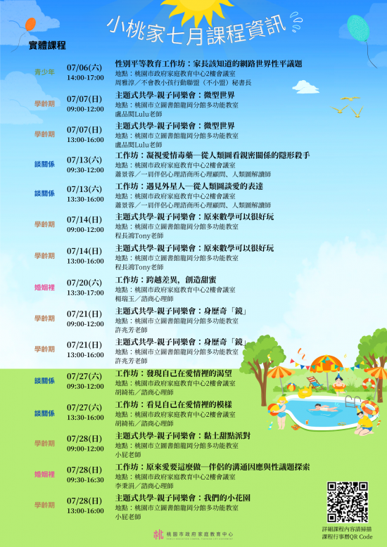 二、旨揭課程詳細資訊,請見中心課程行事曆( https://reurl.cc/xlGyGL )或追蹤「桃園市政府家庭教育中心」FB粉絲專頁;另倘有家庭教育個別化服務需求,可撥打4128185諮詢專線或申請小桃家線上諮詢室( https://reurl.cc/oZWOY5 )服務。