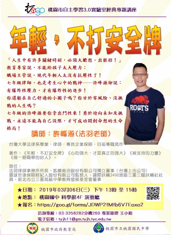 六、參加教師請至本市教師專業發展研習系統報名參加;學生及家長則至桃園國中網頁首頁「自主學習3.0實驗室」聯結報名網址https://goo.gl/forms/JDWP2fMfb6V7Eoxo2。