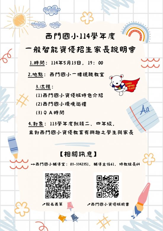 二、 | 為使家長充分了解本校資優教育課程規劃以作為安置學校之參考,特舉辦此說明會,歡迎家長踴躍參加。 |