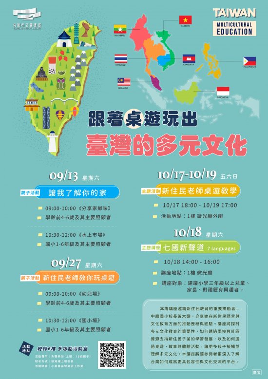 一、臺灣是多元文化的匯聚地,來自不同國家的新住民豐富了我們的語言、飲食與傳統習俗。旨揭活動透過主題講座、親子桌遊推廣課程與文化體驗攤位,讓大人與孩子在遊戲中學習,感受來自東南亞的文化魅力,並探索台灣如何成為文化交融的美好家園。