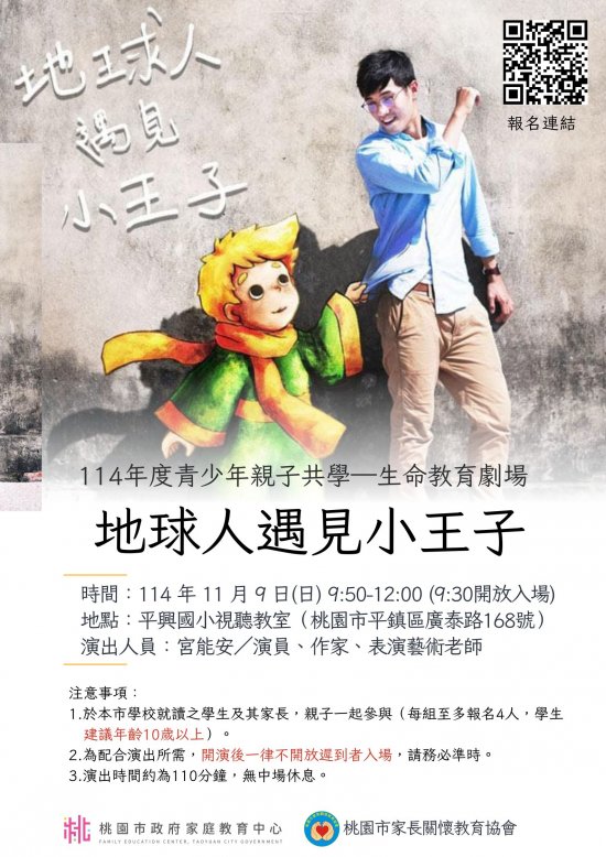 五、報名連結:https://www.beclass.com/rid=305018568ecaa4322c6f;活動於114年10月18日(六)上午10:00開放報名,錄取名單於10月31日(五)公告於本中心官網(https://family.tycg.gov.tw/)。