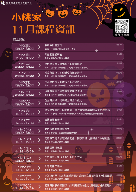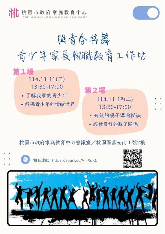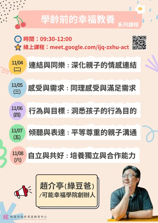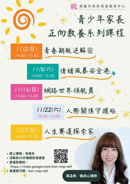 二、旨揭課程詳細資訊,請見中心課程行事曆(https://reurl.cc/xlGyGL)或追蹤「桃園市政府家庭教育中心」FB粉絲專頁;另倘有家庭教育個別化服務需求,可撥打4128185家庭教育諮詢專線,本市市民可申請小桃家線上諮詢室(預約連結:https://reurl.cc/oZWOY5),由中心媒合專業人員透過線上會議室提供服務。