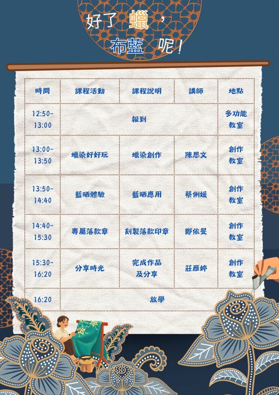| 2、 | 第2梯次:蠟染、藍晒、落款印章。 |