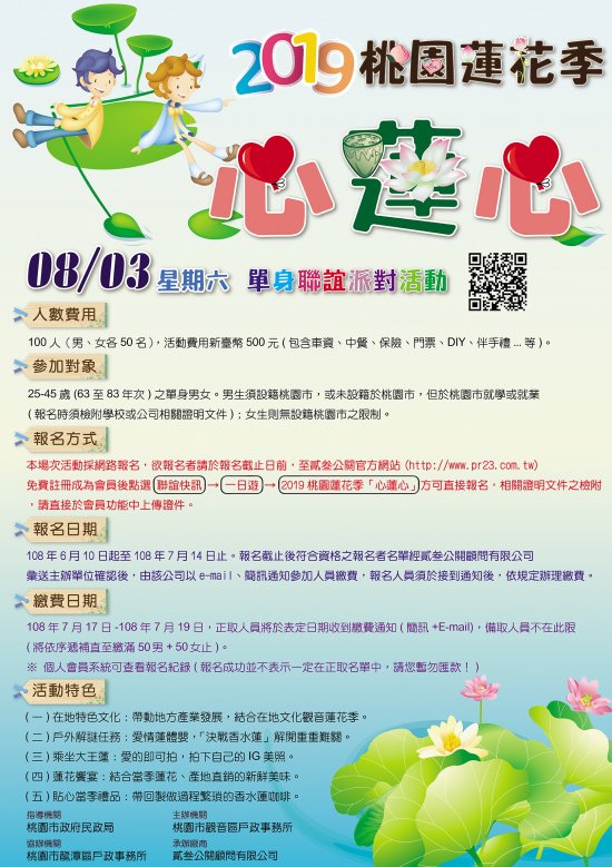 四、參加對象:25至45歲(63至83年次)之單身男女,男生須設籍桃園市,或未設籍於桃園市,但於桃園市就學或就業(報名時須檢附學校或公司相關證明文件);女生無設籍桃園市之限制。