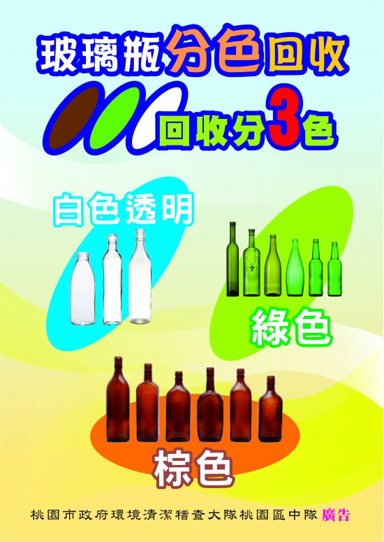 主旨:檢送本大隊「玻璃容器分3色回收」宣導文宣,敬請貴校協助於網路上公告周知,至紉公誼,請查照。。 說明: 一、依據桃園市政府環境清潔稽查大隊各區中隊綜合績效考核計畫辦理。 二、為利後端回收處理作業,玻璃瓶分白色透明、棕色及綠色三種顏色回收,以提高回收再生品質,請貴校惠予協助宣導玻璃容器分色回收之注意細項。