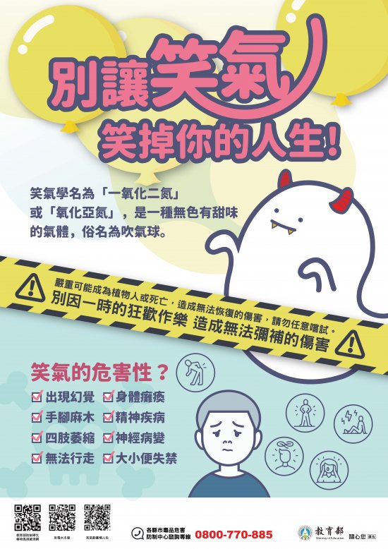 二、為宣導笑氣(氧化亞氮)之危害性,教育部製作文宣海報1款,請協助強化宣導家長及一般民眾相關資訊,並可結合各項活動共同宣導,歡迎多加利用。