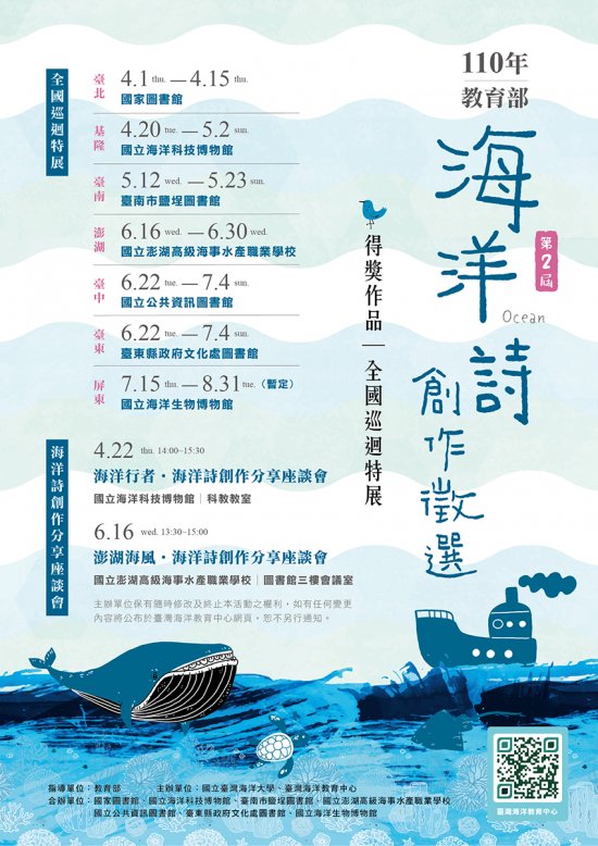 二、為提升群眾對臺灣各地海洋文化特色的了解,並使更多師生與民眾欣賞優良海洋文化創作詩作,將以分組分區形式至全國各地進行教育推廣,使有志於以文學藝術形式之多元管道推動海洋教育者與純粹享受閱讀樂趣受眾者皆有所收穫,落實提升全民海洋素養政策,逐漸達成海洋生活化的理想。本次除全國巡迴特展,將辦理2場「海洋詩創作分享座談會」,邀請得獎師生進行詩作賞析,並分享如何透過教學實踐歷程帶領與指導學生進行創作。