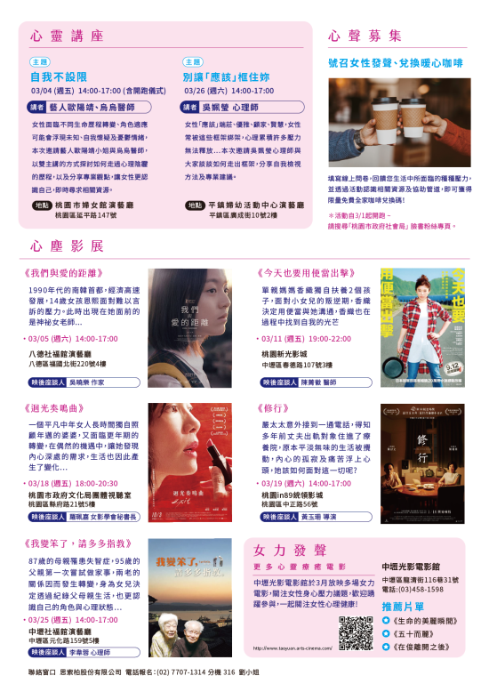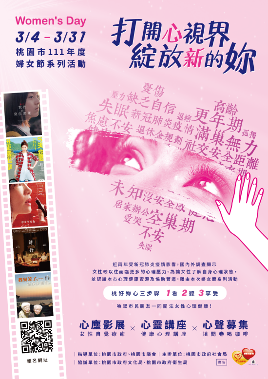 一、依據本府社會局111年2月16日桃社綜字第1110014173號函辦理。 二、近兩年受新冠肺炎疫情影響,國內外調查顯示女性較以往面臨更多的心理壓力,本市111年度婦女節系列活動以關注「女性心理健康」為主軸,透過「桃好妳心 三步驟 1看2聽3享受」辦理心靈講座、心塵影展及心聲募集活動,讓女性了解自身心理狀態,並進一步認識心理健康資源及協助管道。 三、前揭婦女節系列活動共計辦理2場心靈座談及5場心塵影展(含映後座談),活動一覽表詳如附件,鼓勵貴校所屬人員踴躍參加。