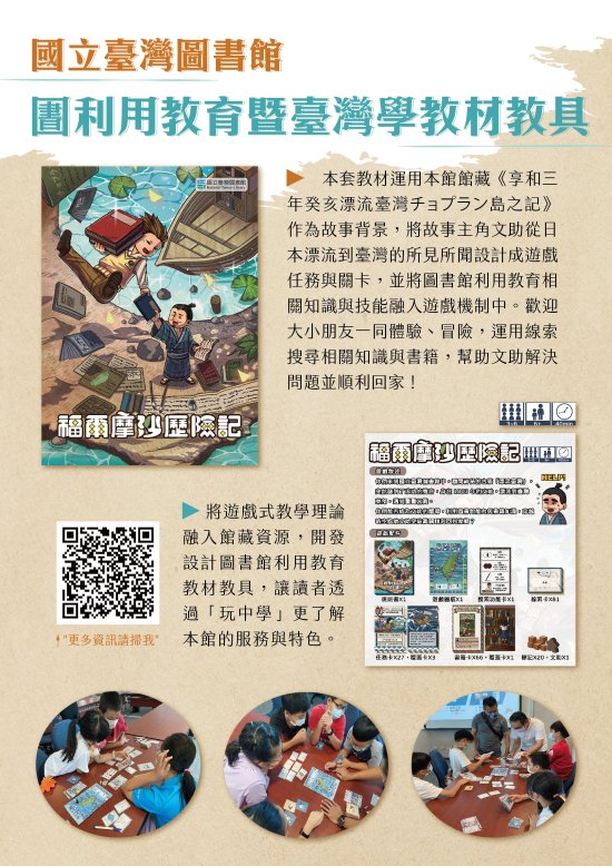 二、「福爾摩沙歷險記(桌遊)」係運用本館館藏《享和三年癸亥漂流臺灣チョプラン島之記》作為故事背景,將故事主角文助從日本漂流到臺灣的所見所聞設計成遊戲任務與關卡,並將圖書館利用教育相關知識與技能融入遊戲機制中。玩家須運用線索搜尋相關書籍與知識,幫助文助解決問題並順利回家!