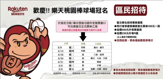 三、樂天於112年8月起安排7場次免費招待桃園市民及桃園市高中、國中、國小學生免費進場觀賽,各行政區民眾可於各區優惠當日持身分證件(無身分證之孩童須出示健保卡及戶口名簿)至現場索取免費門票,學生則可持桃園市學生證至7場次現場索取免費門票,場次分別為8月9日(龜山、蘆竹)、8月10日(楊梅)、8月29日(八德、龍潭)、8月30日(觀音、大溪、平鎮)、8月31日(桃園)、9月6日(中壢)、9月8日(復興、大園、新屋)。