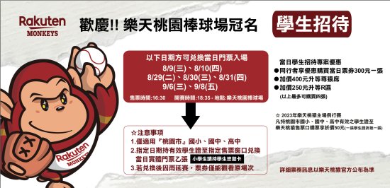 四、此外,本季加碼回饋本市高、國中小學生持學生證至現場購票,每場次享票價折扣50元,歡迎市民朋友踴躍進場看球,共挺桃猿;為利民眾充分知悉活動資訊,請各校協助公告周知,鼓勵學生進場觀賽。